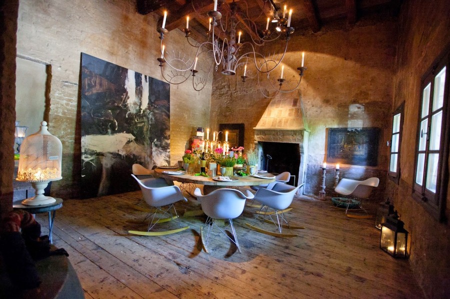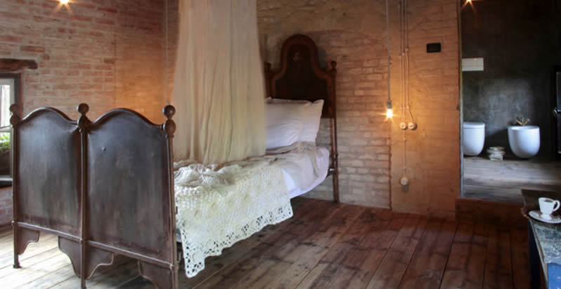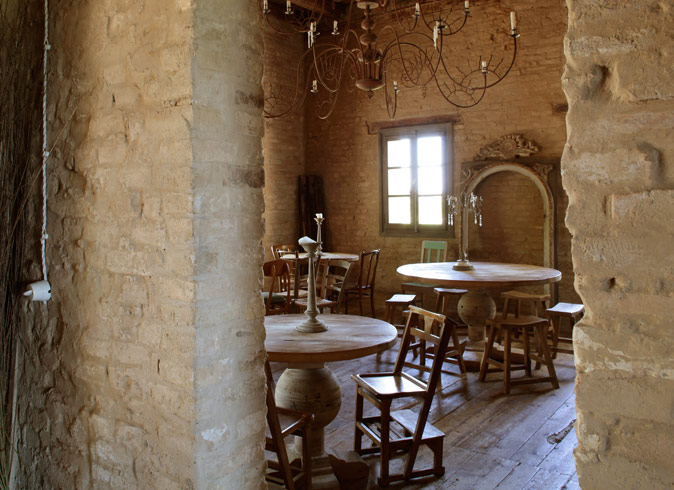 Murs en briques apparents, planchers et poutres originaux ainsi que l'utilisation de matériaux et objets naturels, donnent à ce veiux moulin une atmosphère minimaliste et austère, fidèle à l'originale, mais avec un charme secret, surtour le soir, quand tout est éclairé aux chandelles.